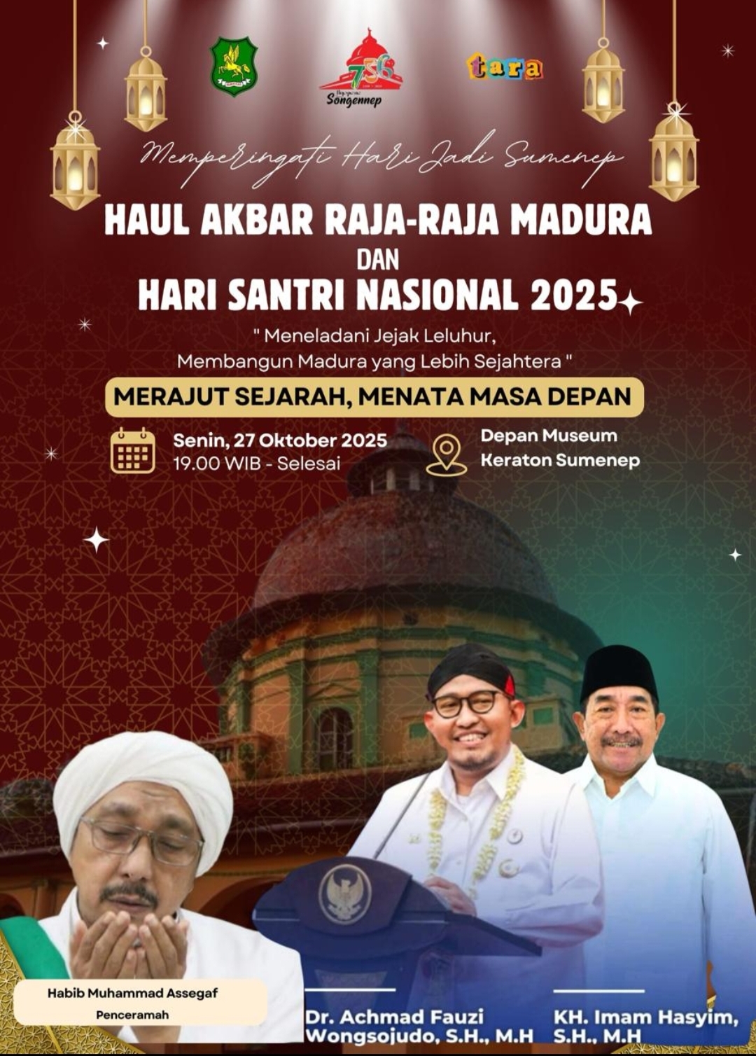 SUMENEP, nusainsider.com — Dalam rangka memperingati Hari Jadi Sumenep ke-756 sekaligus Hari Santri Nasional 2025, Pemerintah Kabupaten (Pemkab) Sumenep akan menggelar Haul Akbar Raja-Raja Madura pada Senin malam (27/10/2025) di depan Museum Keraton Sumenep, mulai pukul 19.00 WIB.
